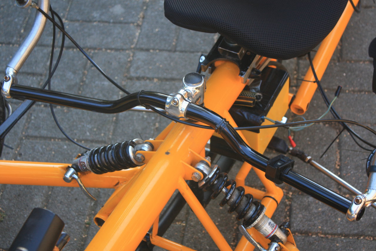 Die Federung vorne und hinten funktionierten gut. Mit Bafang BBS01 war es ein fliegendes Sofa. Leider hat es am Querlenkerkäfig Risse gegeben. Die wurden geschweißt und verstärkt.