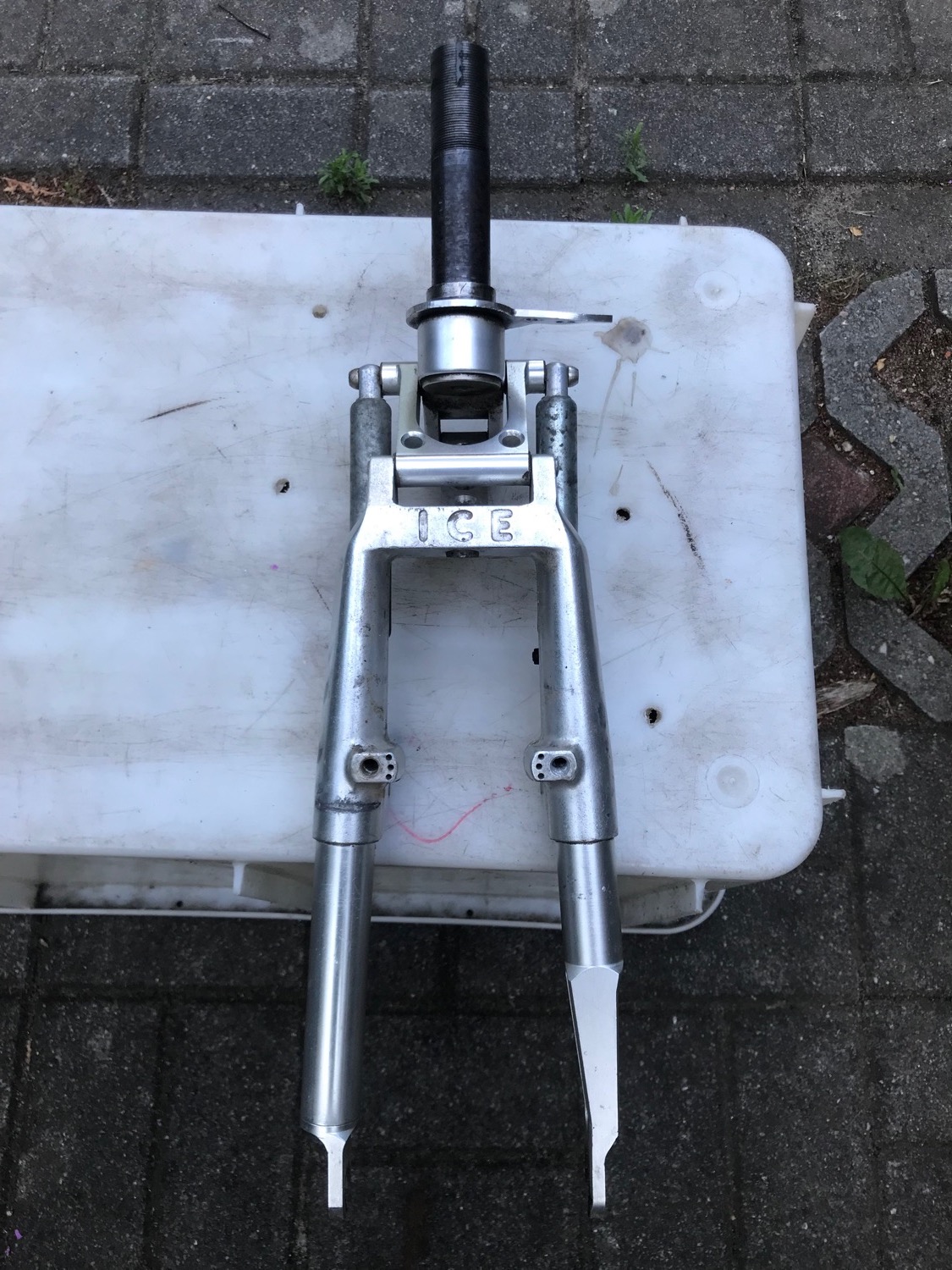 Sie hat schon einige Wiesel gesehen, passt perfekt in ein Stahlwiesel wo sie ja auch gut mit 1 Zoll Gabelschaft passt. Es gibt wenige Aluwiesel mit 1 Zoll Gabelschaft deshalb benötigte ich nun einen Adapter damit die Gabel auch in einem neueren Wiesel eingebaut werden kann.