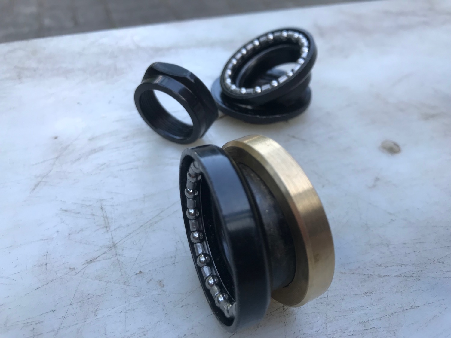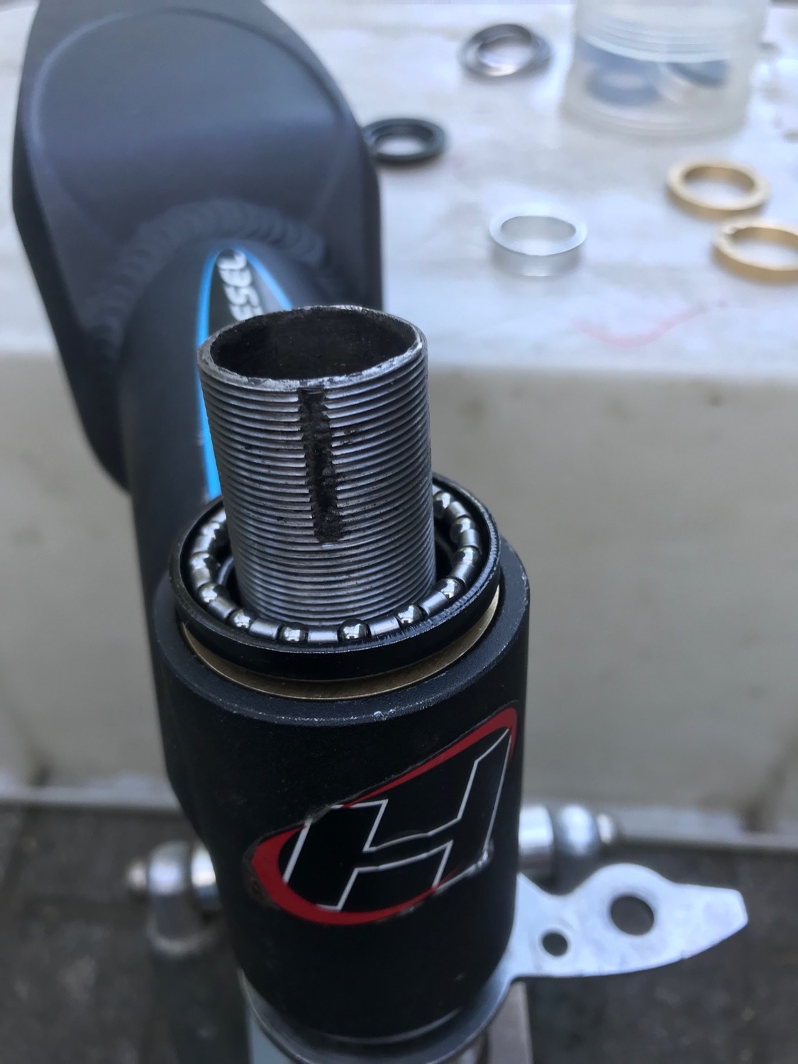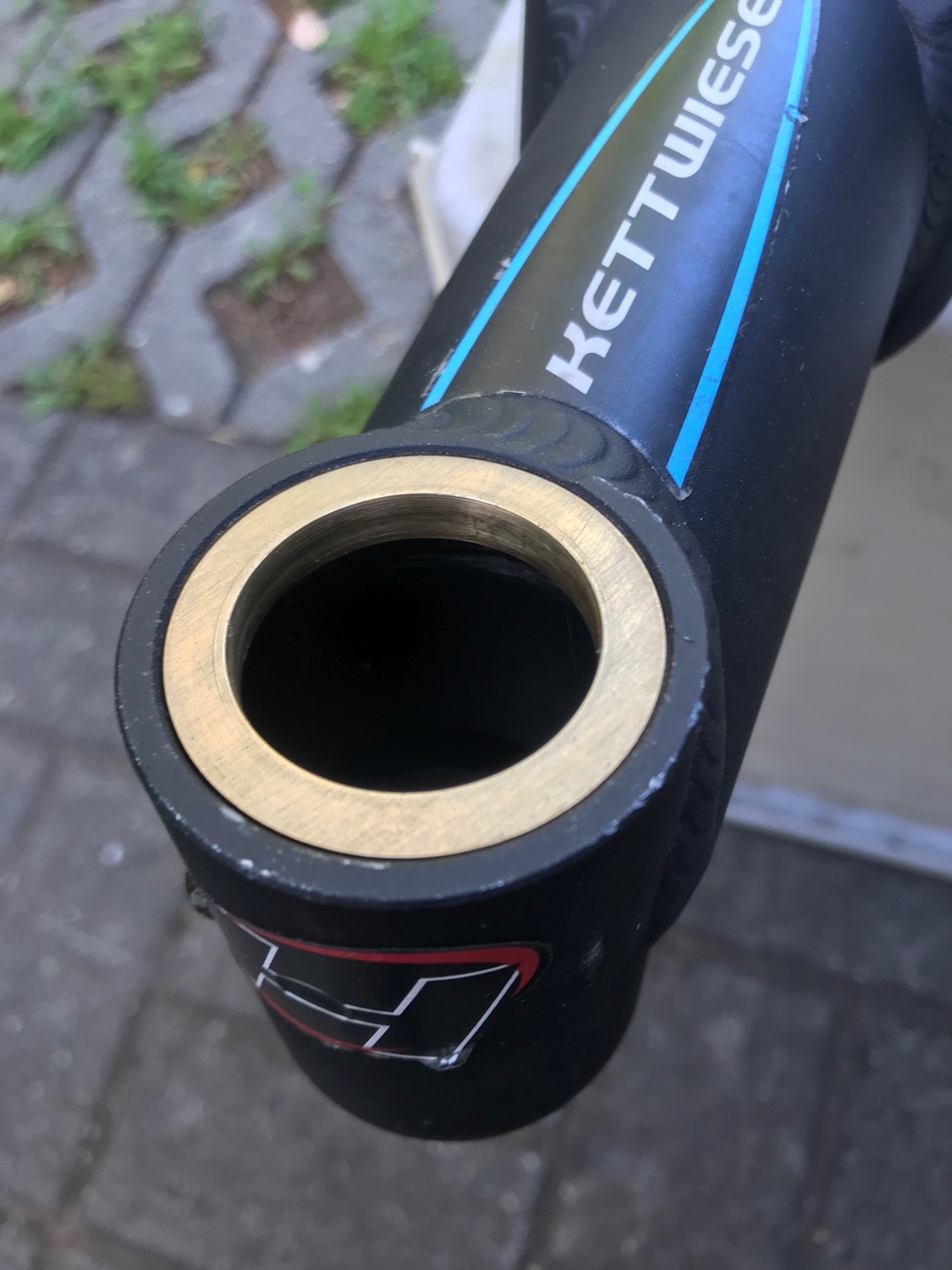 Hohes Wiesel fragte mich ob man die 1Zoll Lagerschalen nicht direkt in die Öffnung drücken könnte. Bei dem hier gezeigten Steuerlager würde es vom Platz her auch fast +-passen. Aber die haben im Holm so wenig Auflagefläche und ich denke auf Zeit werden sie sich dort auch ein-verkanten.
